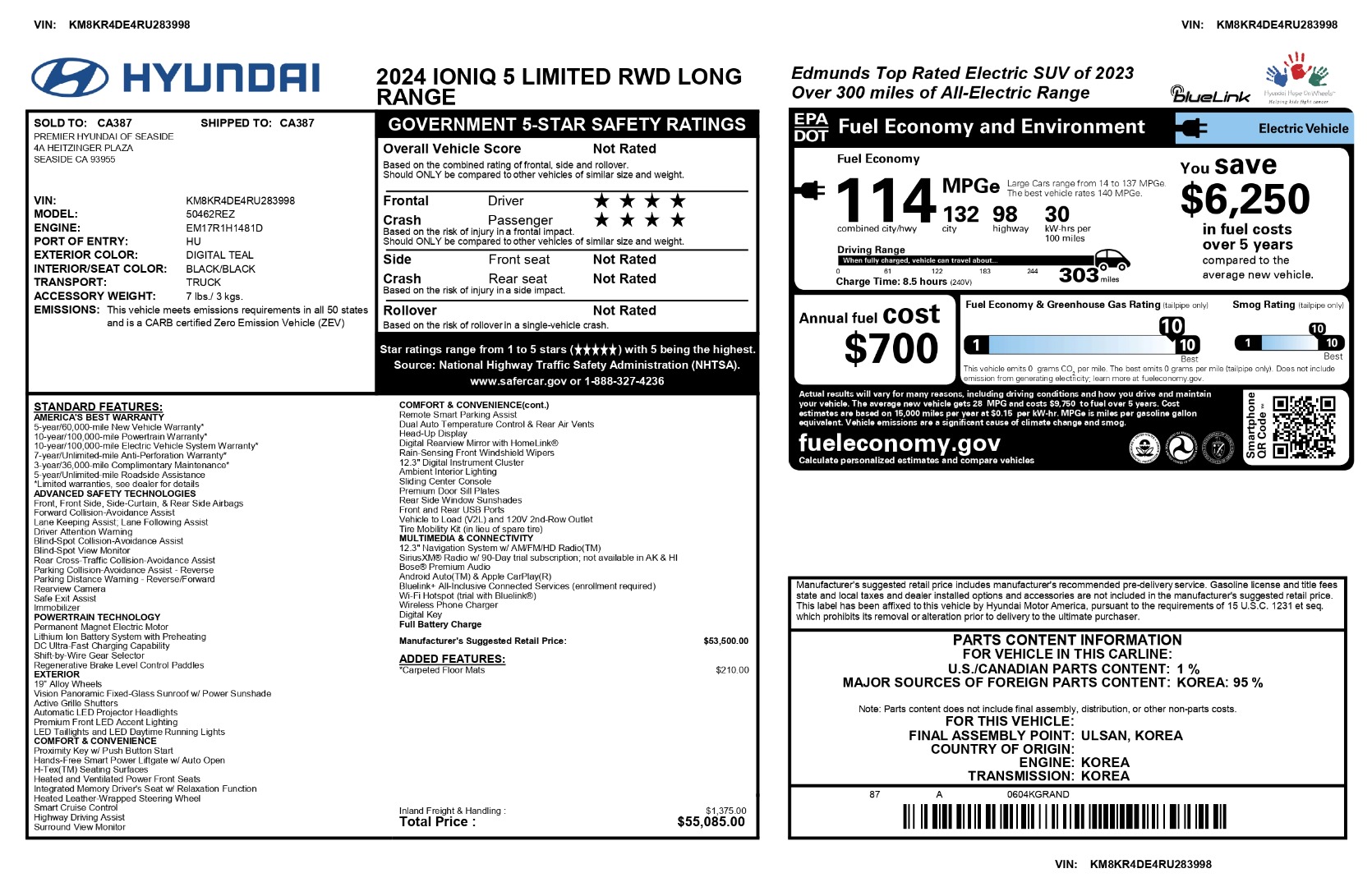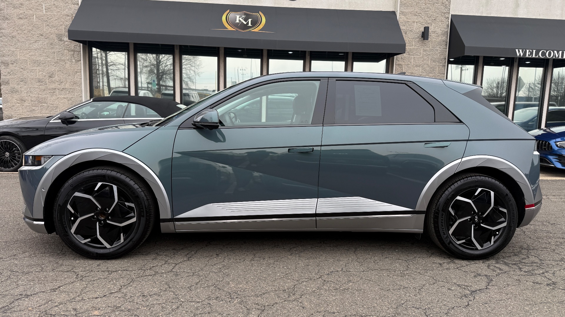 *** ONE OWNER/MSRP $55K/ 19” ALLOY WHEELS / VISION PANORAMIC FIXED-GLASS SUNROOF/ HEAD-UP DISPLAY /BOSE PREMIUM AUDIO/ HEATED & VENTILATED FRONT SEATS/ SURROUND VIEW MONITOR/ HIGHWAY DRIVING ASSIST/ REMOTE SMART PARKING ASSIST ***this digital teal exterior with black interior, permanent magnet electric motor with lithium ion battery system and dc ultra-fast charging capability; 19” alloy wheels, vision panoramic fixed-glass sunroof with power sunshade, active grille shutters, automatic led projector headlights, premium front led accent lighting, led taillights and led daytime running lights; proximity key with push button start, hands-free smart power liftgate with auto open, h-tex seating surfaces, heated and ventilated power front seats, integrated memory driver’s seat with relaxation function, heated leather-wrapped steering wheel, smart cruise control, highway driving assist, surround view monitor; head-up display, digital rearview mirror with homelink®, 12.3” digital instrument cluster, ambient interior lighting, sliding center console, premium door sill plates, rear side window sunshades, front and rear usb ports, vehicle to load (v2l) and 120v 2nd-row outlet, bose premium audio, android auto™ and apple carplay®, siriusxm® radio with 90-day trial subscription, bluelink® connected services (enrollment required), wireless phone charger, digital key, full battery charge; carpeted floor mats, and much more… *** CARFAX CERTIFIED & VA INSPECTED *** NATIONAL SHIPPING AT ADDITIONAL COST *** REMAINING FACTORY WARRANTY ***