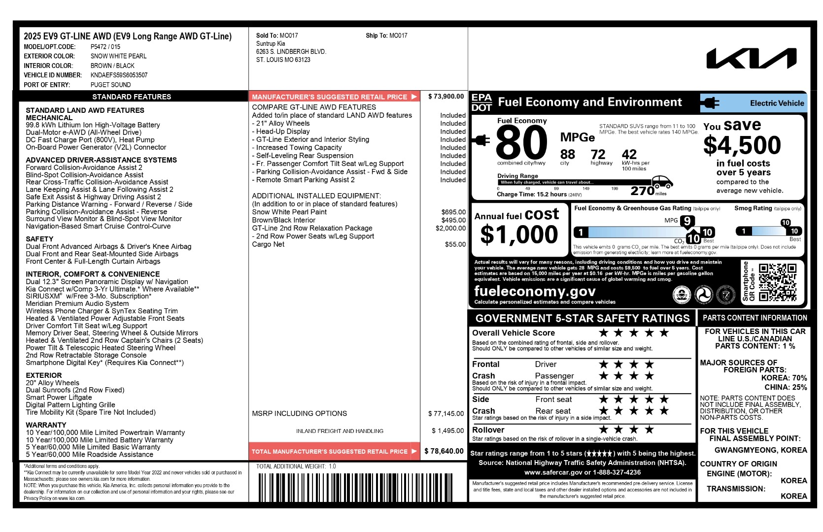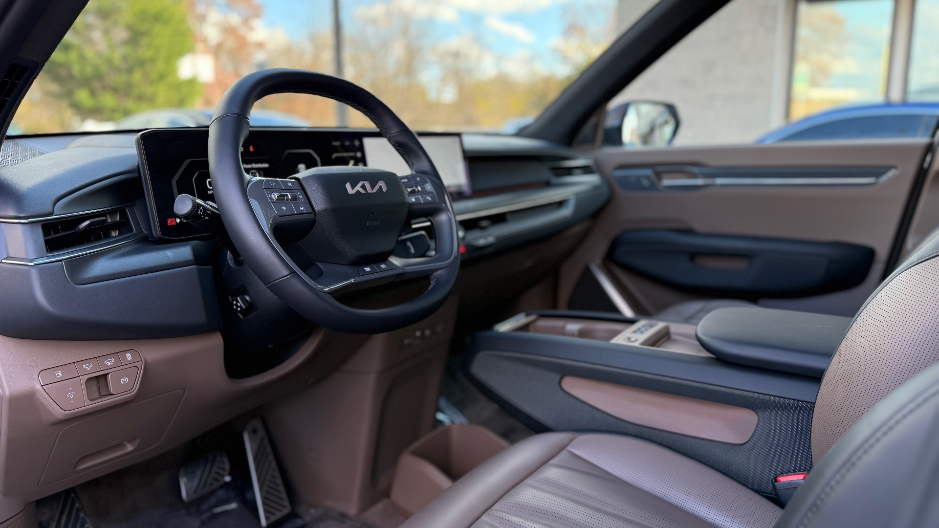 *** ONE OWNER/ MSRP $78K / DUAL-MOTOR e-AWD / HEAD-UP DISPLAY / 21” ALLOY WHEELS / REMOTE SMART PARKING ASSIST 2 / SELF-LEVELING REAR SUSPENSION / SURROUND VIEW & BLIND-SPOT VIEW MONITORS / HEATED & VENTILATED FRONT SEATS & 2ND ROW CAPTAIN'S CHAIRS/ MERIDIAN PREMIUM AUDIO SYSTEM *** this snow white pearl exterior with brown/black interior is equipped with the 99.8 kwh lithium-ion high-voltage battery, dual-motor e-awd (all-wheel drive), dc fast charge port (800v), on-board power generator (v2l), and drive mode select; top features include surround view monitor, blind-spot view monitor, forward collision-avoidance assist 2, rear cross-traffic collision-avoidance assist, safe exit assist & highway driving assist 2, parking distance warning (front/rear), parking collision-avoidance assist (fwd & side), remote smart parking assist 2, lane keeping assist & lane following assist, driver attention warning, dual 12.3” panoramic display with navigation, kia connect w/free 3-mo. subscription**, siriusxm® w/free 3-mo. subscription**, meridian premium audio system, wireless phone charger, heated & ventilated power-adjustable front seats, memory driver seat, heated 2nd-row captain’s chairs (2 seats), power tilt & telescopic heated steering wheel, rain-sensing front wipers, dual sunroofs (2nd row fixed), roof rails & rear spoiler, digital key 2, led lighting group (headlamps / drl / taillights), and smart power liftgate with auto-open; added features include snow white pearl paint ($595), brown/black interior ($345), carpeted floor mats (6-passenger) ($225), cargo net ($55); inland freight & handling ($1,495); total price $78,680, and much more… *** CARFAX CERTIFIED & VA INSPECTED *** NATIONAL SHIPPING AT ADDITIONAL COST *** REMAINING FACTORY WARRANTY ***